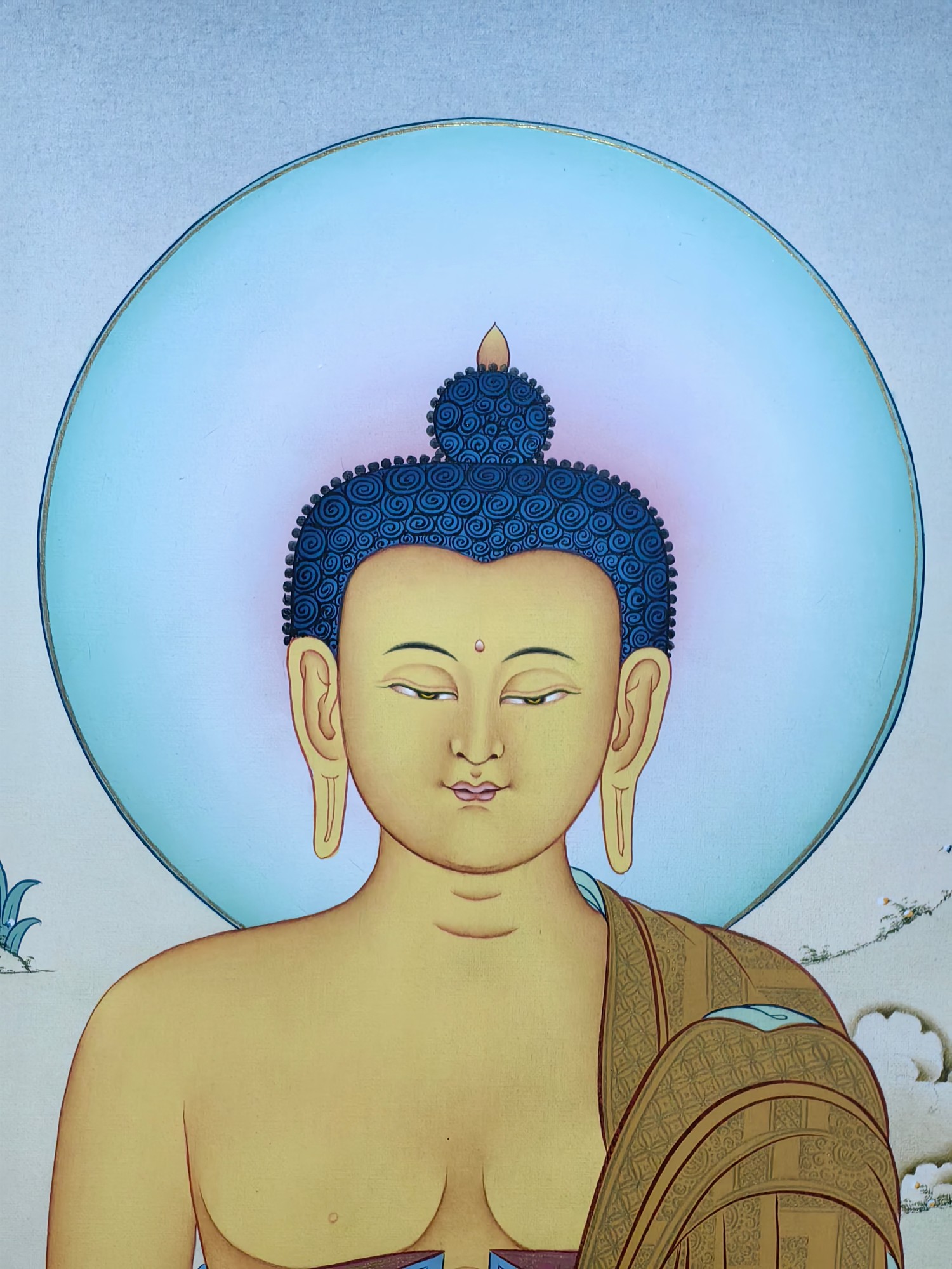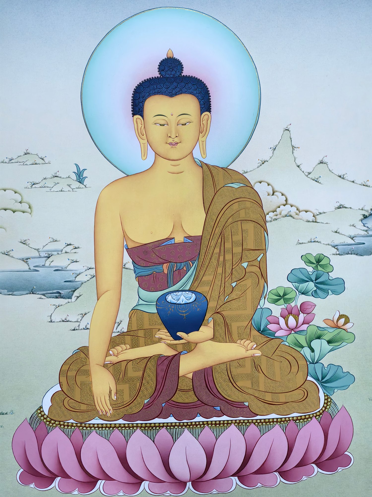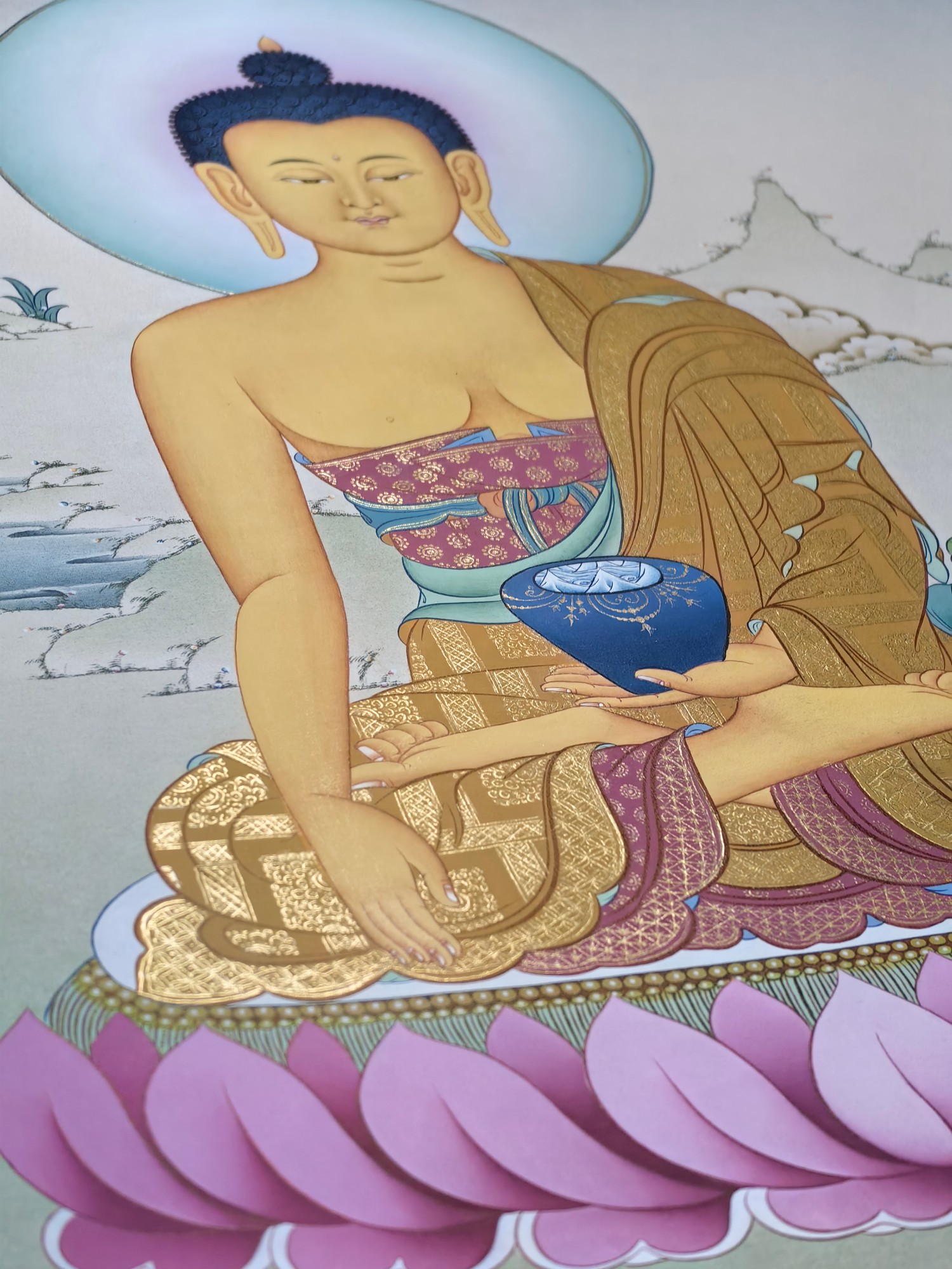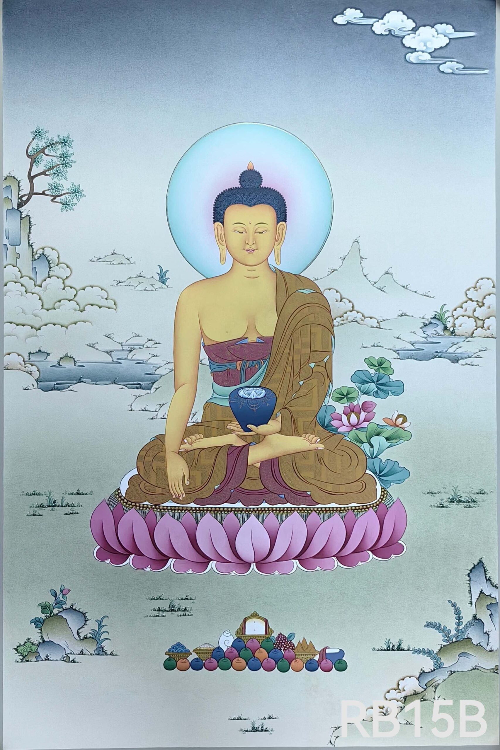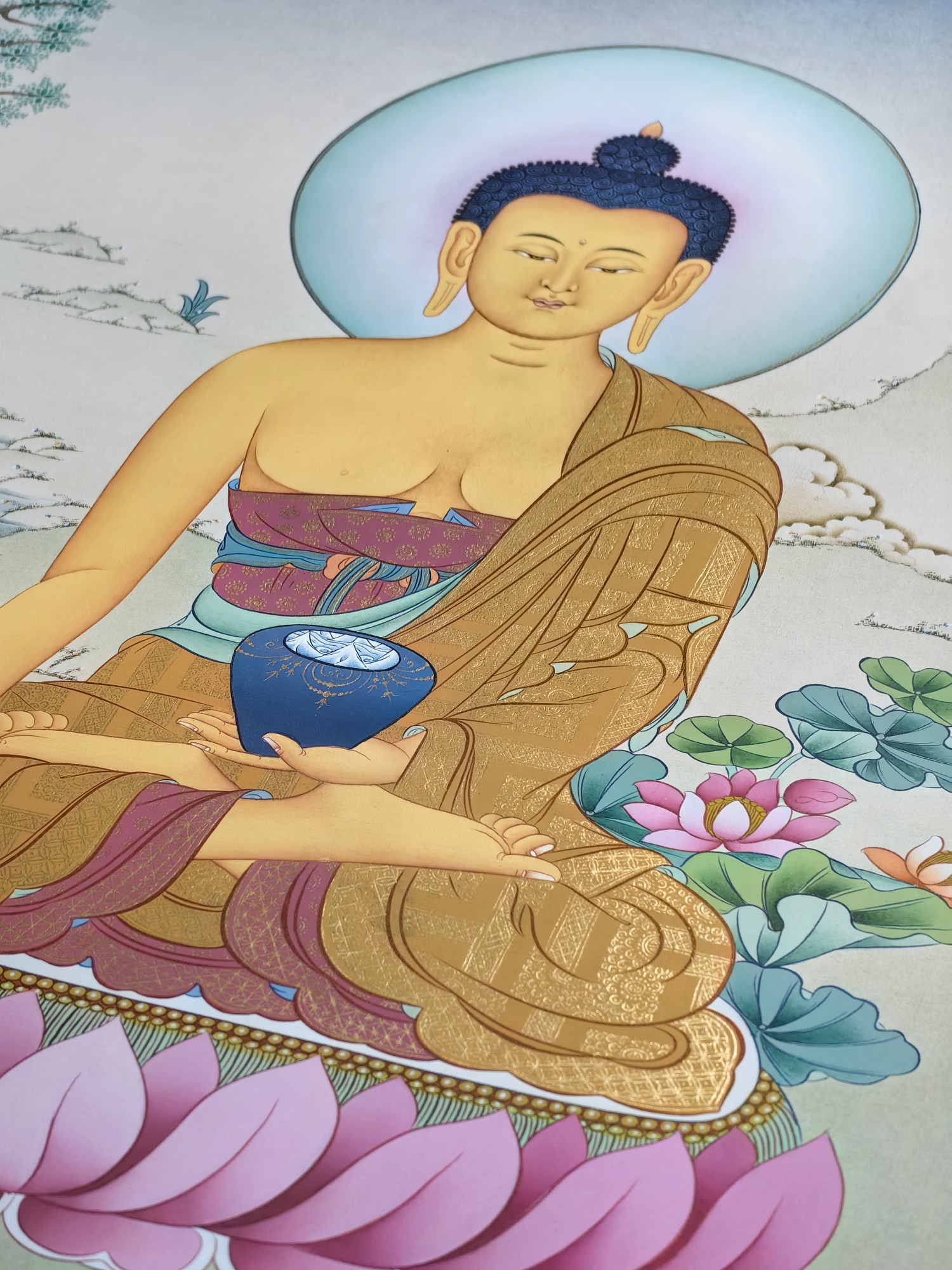 ▫️ 工艺:纯手绘绘制,24K黄金描金,天然矿彩 ▫️ 风格:碧潭坡岸为景,金彩交融,庄严中见自然静谧 ▫️ 结缘方式:恭迎咨询请藏 ✨ 中央主尊:释迦牟尼佛 · 金色身相慈悲庄严,结跏趺坐于莲花月轮 · 右手触地印,表降魔成道;左手托钵,象征慈悲应供、福慧双融 · 身后并无树木,唯见头光圆满璀璨,喻智慧光明遍照十方,清净无碍 🎨 自然意蕴: · 碧潭清波为底:宁静水面泛微光,映照天光佛影,显法性如镜 · 绿坡浅丘环抱:柔草纤茸,山石润泽,喻世间皆成道场 · 24K黄金描金:头光、衣纹、钵体以真金精细勾勒,金光流淌,圣妙辉煌 · 矿彩清雅点染,朱砂、石绿、金橙轻缀其间,庄严中透出天地生机 📿 此幅尤宜佛堂、禅室、净修空间供奉 · 助众生净心明性、断惑证真、离苦得乐 · 寂静供养,可启般若智、增福德资、化烦恼缘、成菩提道 🙏 愿见此像者,皆得佛陀慈光注照 心似碧水无波,志若青山不移,世出世间圆满自在 恭迎有缘者奉请,永驻自然圣境,共证如来妙智。