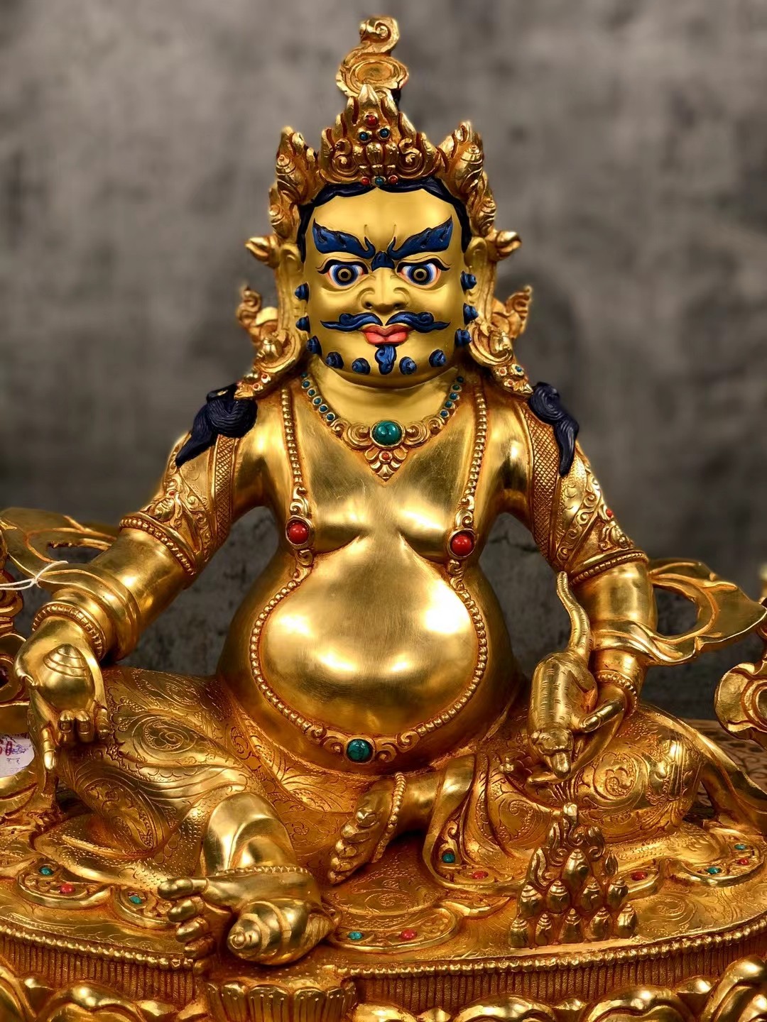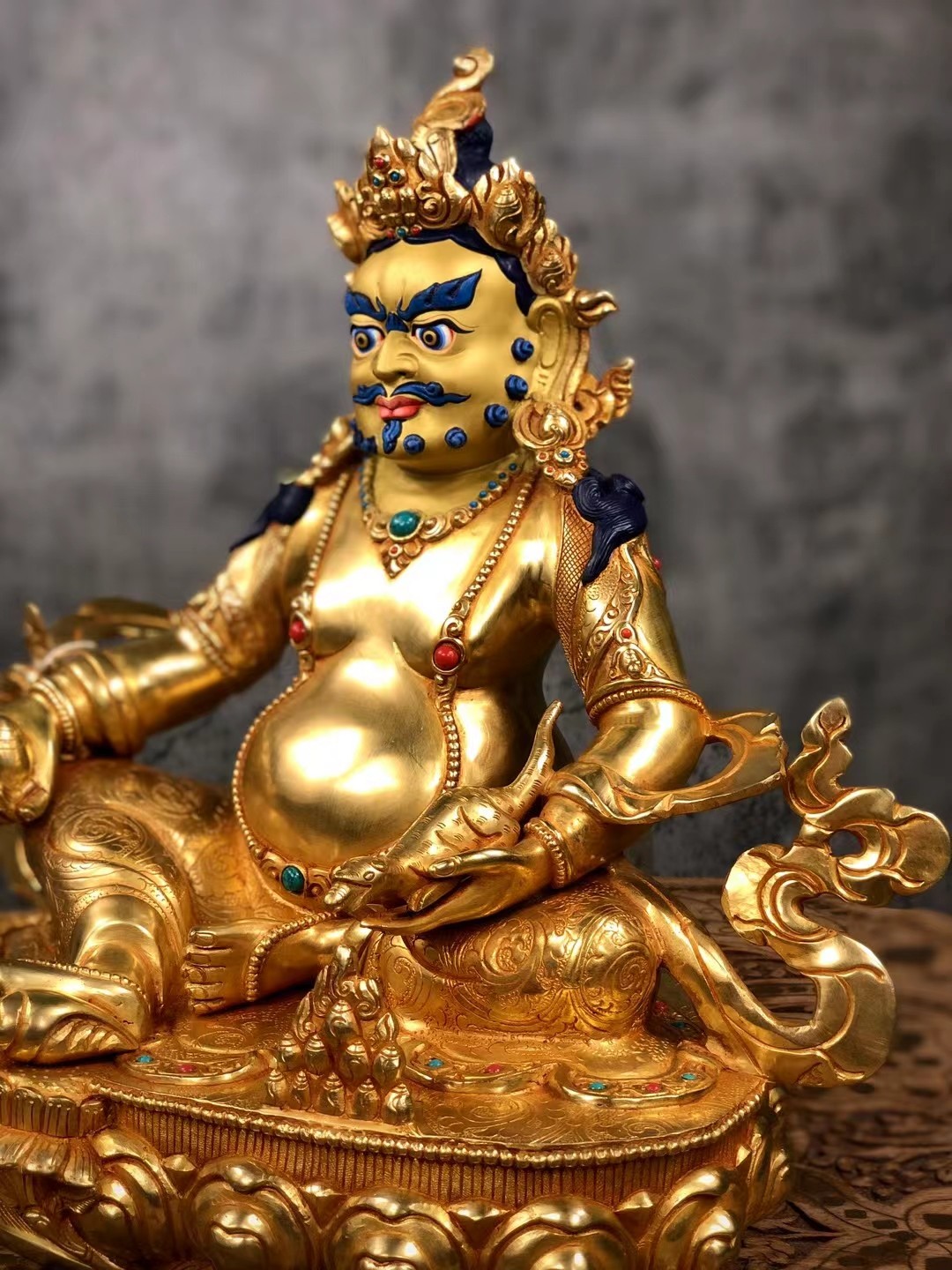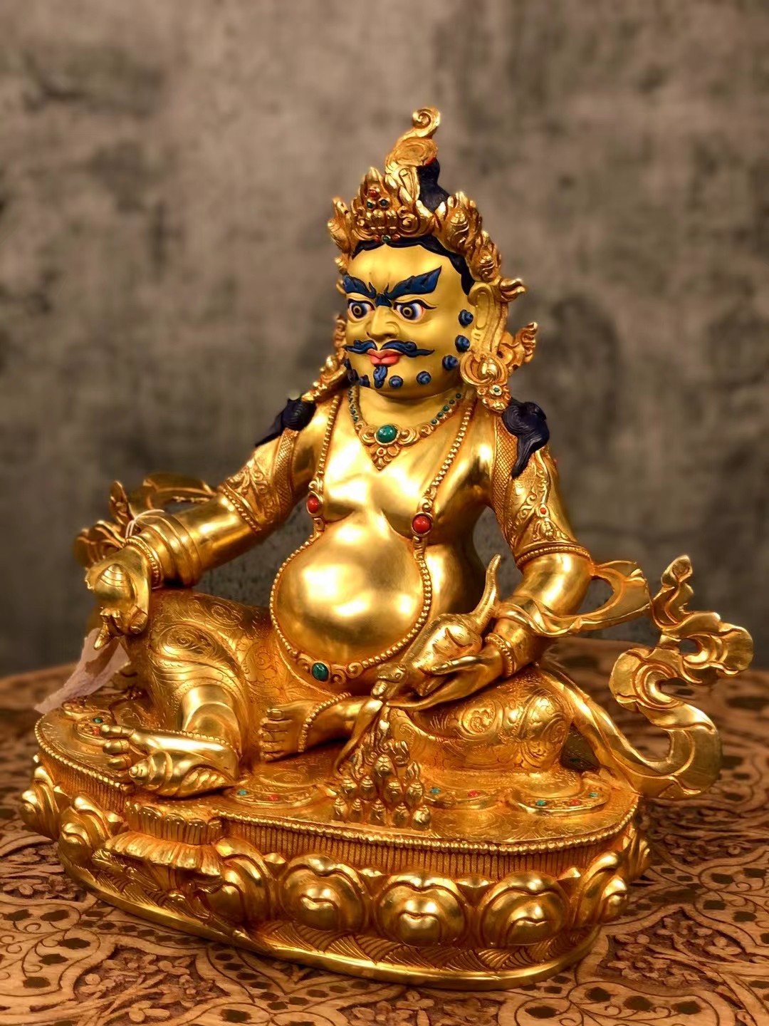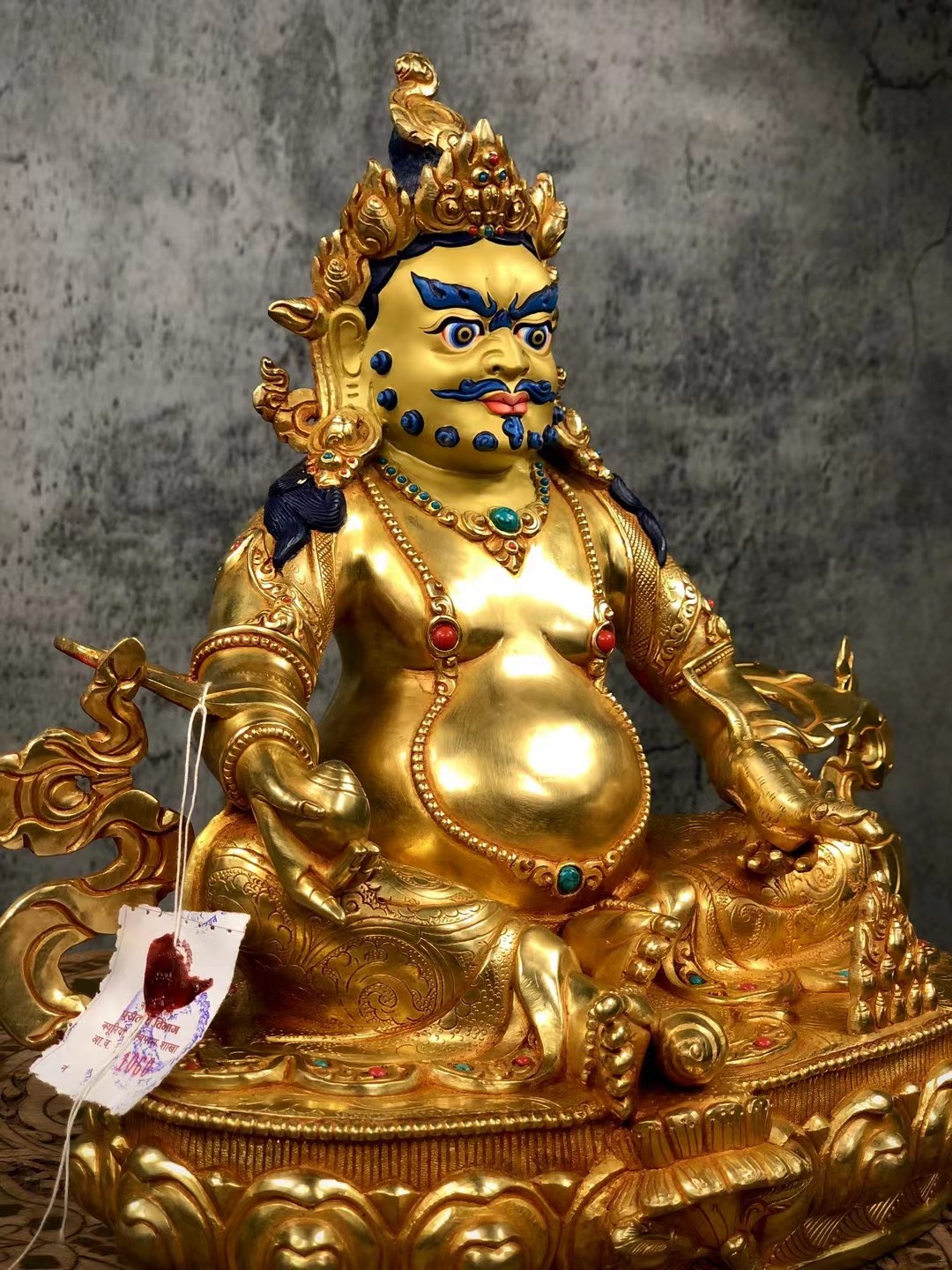 《黄财神》采用24K黄金,老工匠最好的鎏金工艺,纯手工打磨錾刻,手工痕迹清晰可见,尼泊尔名师泥金开面,做工超精细,底部可打开装藏,传统失蜡法塑模,纯紫铜胎底,表面鎏金嵌宝工艺!鎏金鎏的是纯金,这尊开脸开眼十分殊胜,身上的花纹是手工錾刻🙏性价比超高!市面上非常少见的极品[强]收藏供奉首选 传世级精品 期待有缘人!【主尊介绍】黄财神,藏文叫做“诺拉”,翻译成汉文叫做“财神”。 藏名叫作“占巴拉色波”或“藏色”,他的色肤是黄色,故称为黄财神,是密教之护法神祇,诸财神之首,黄财神为藏地各大教派奉持的五色财神之一,修持黄财神法、持诵其密咒,可获得黄财神庇佑,能增长福德、寿命、智慧、物质及精神上之受用。主司财富,能使一切众生脱于贫困,财源广进。