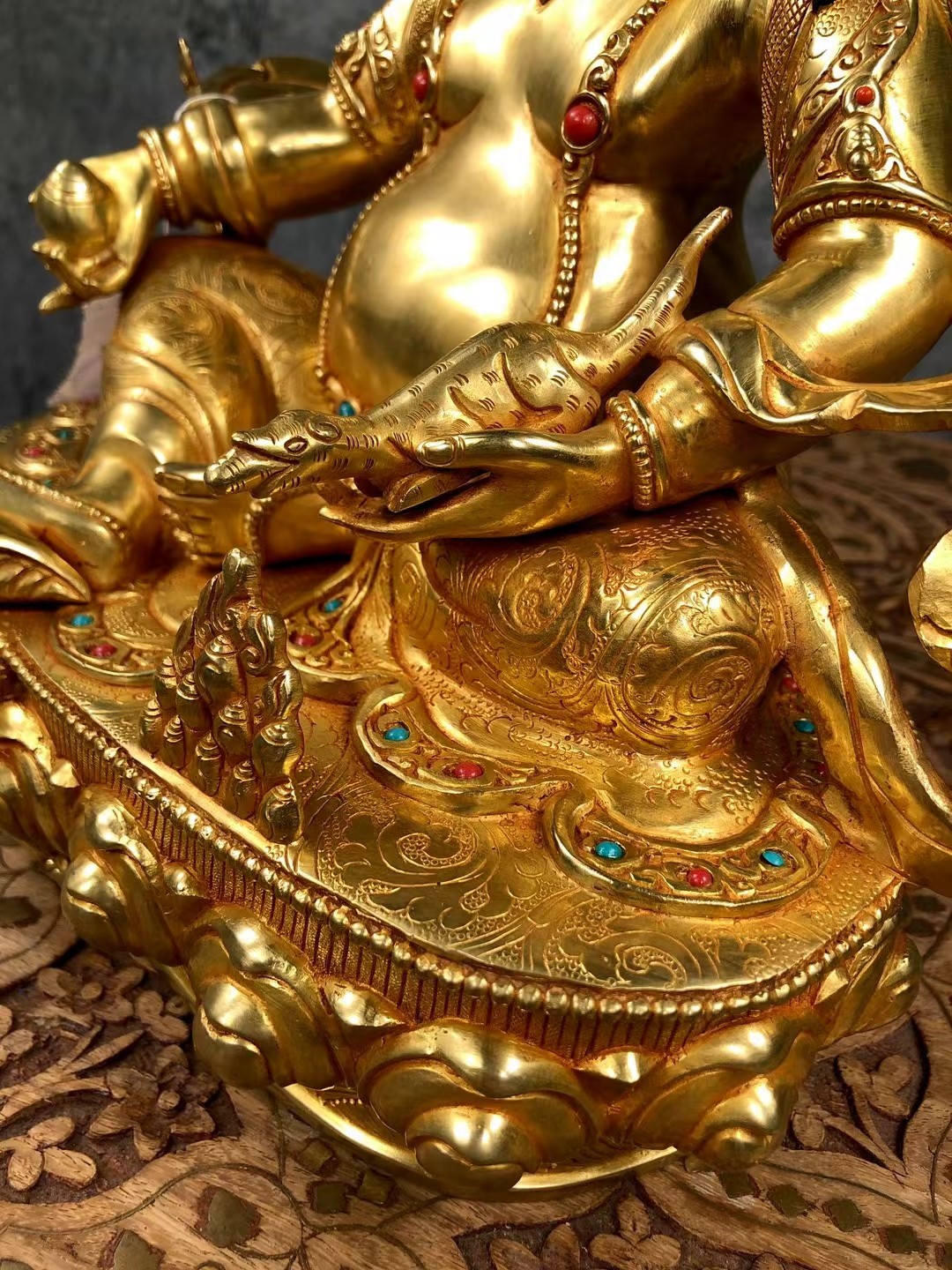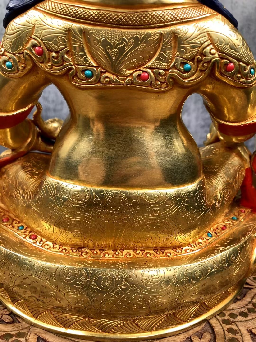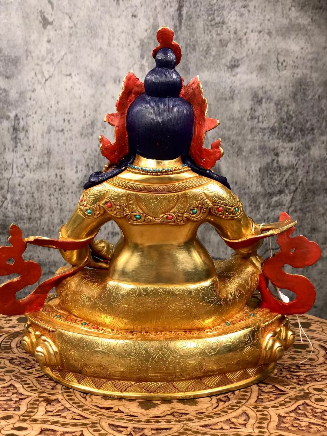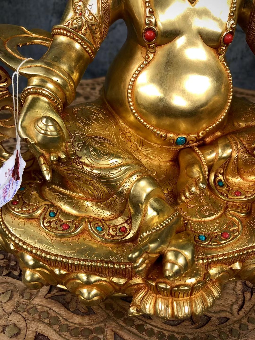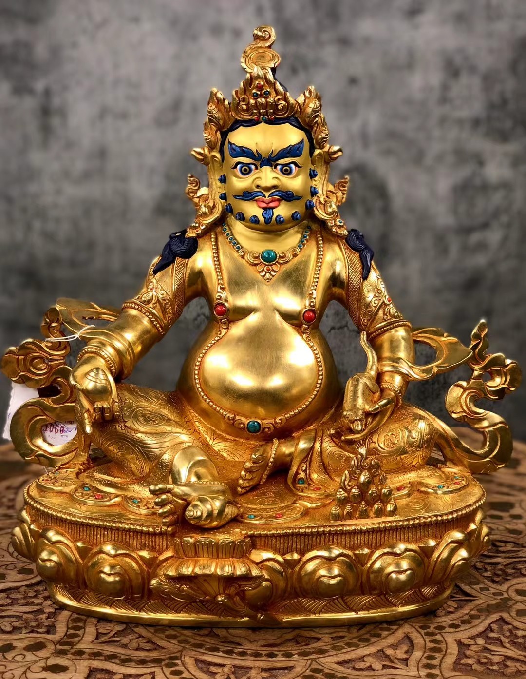 《黄财神》采用24K黄金,老工匠最好的鎏金工艺,纯手工打磨錾刻,手工痕迹清晰可见,尼泊尔名师泥金开面,做工超精细,底部可打开装藏,传统失蜡法塑模,纯紫铜胎底,表面鎏金嵌宝工艺!鎏金鎏的是纯金,这尊开脸开眼十分殊胜,身上的花纹是手工錾刻🙏性价比超高!市面上非常少见的极品[强]收藏供奉首选 传世级精品 期待有缘人!【主尊介绍】黄财神,藏文叫做“诺拉”,翻译成汉文叫做“财神”。 藏名叫作“占巴拉色波”或“藏色”,他的色肤是黄色,故称为黄财神,是密教之护法神祇,诸财神之首,黄财神为藏地各大教派奉持的五色财神之一,修持黄财神法、持诵其密咒,可获得黄财神庇佑,能增长福德、寿命、智慧、物质及精神上之受用。主司财富,能使一切众生脱于贫困,财源广进。